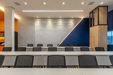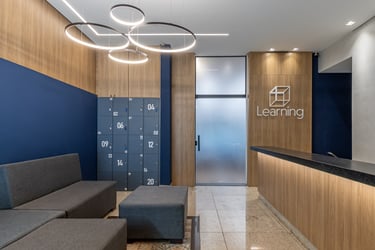 O espaço educacional conta com recepção, escaninhos, lounge para coffee break e mesas de estudo e espaço para aulas práticas de procedimentos odontológicos.