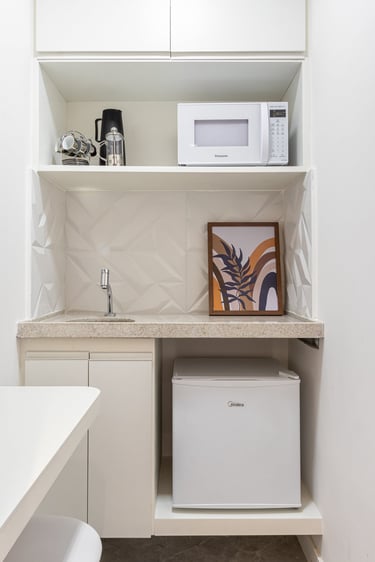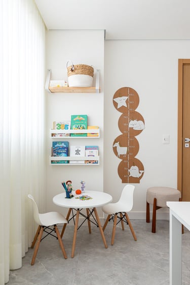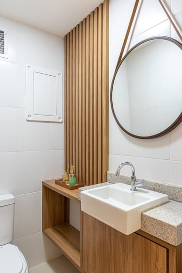 Os tons claros dos acabamentos e mobiliários proporcionam sensação de calma, amplitude e organização. A madeira entra nos detalhes trazendo a sensação de aconchego e conforto.
