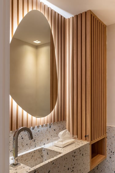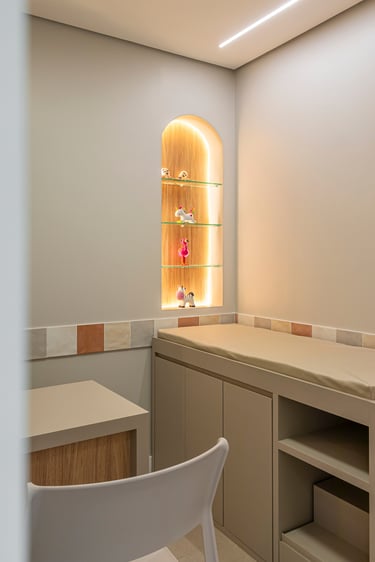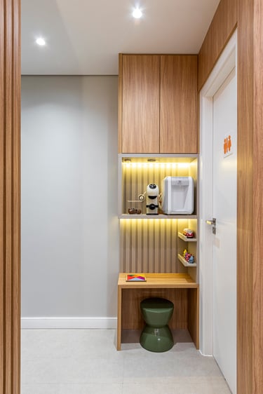 A combinação dos acabamentos utilizados, como a madeira, o mármore e os revestimentos coloridos, traz sensação de ludicidade, leveza e modernidade para o espaço.